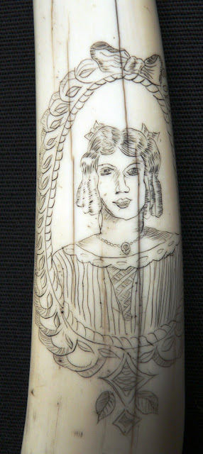 she carefully, softly, carves with her scrimshander's art
